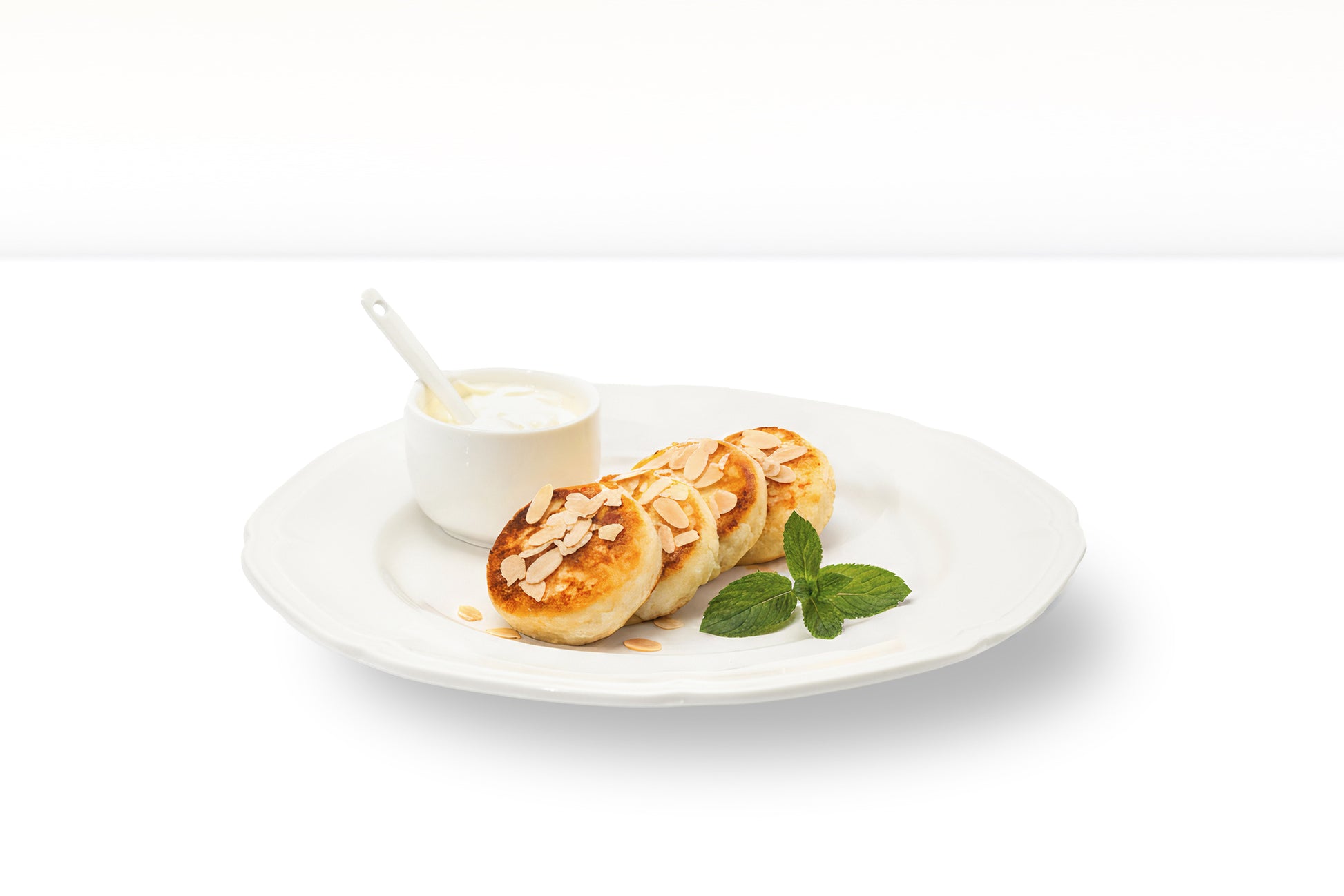3. Sobald die Sirniki fertig sind, nehmen Sie sie aus der Pfanne und legen Sie sie auf einen Teller. Servieren Sie sie warmmit Sauerrahm, Marmelade oder Honig– ganz nach Geschmack.