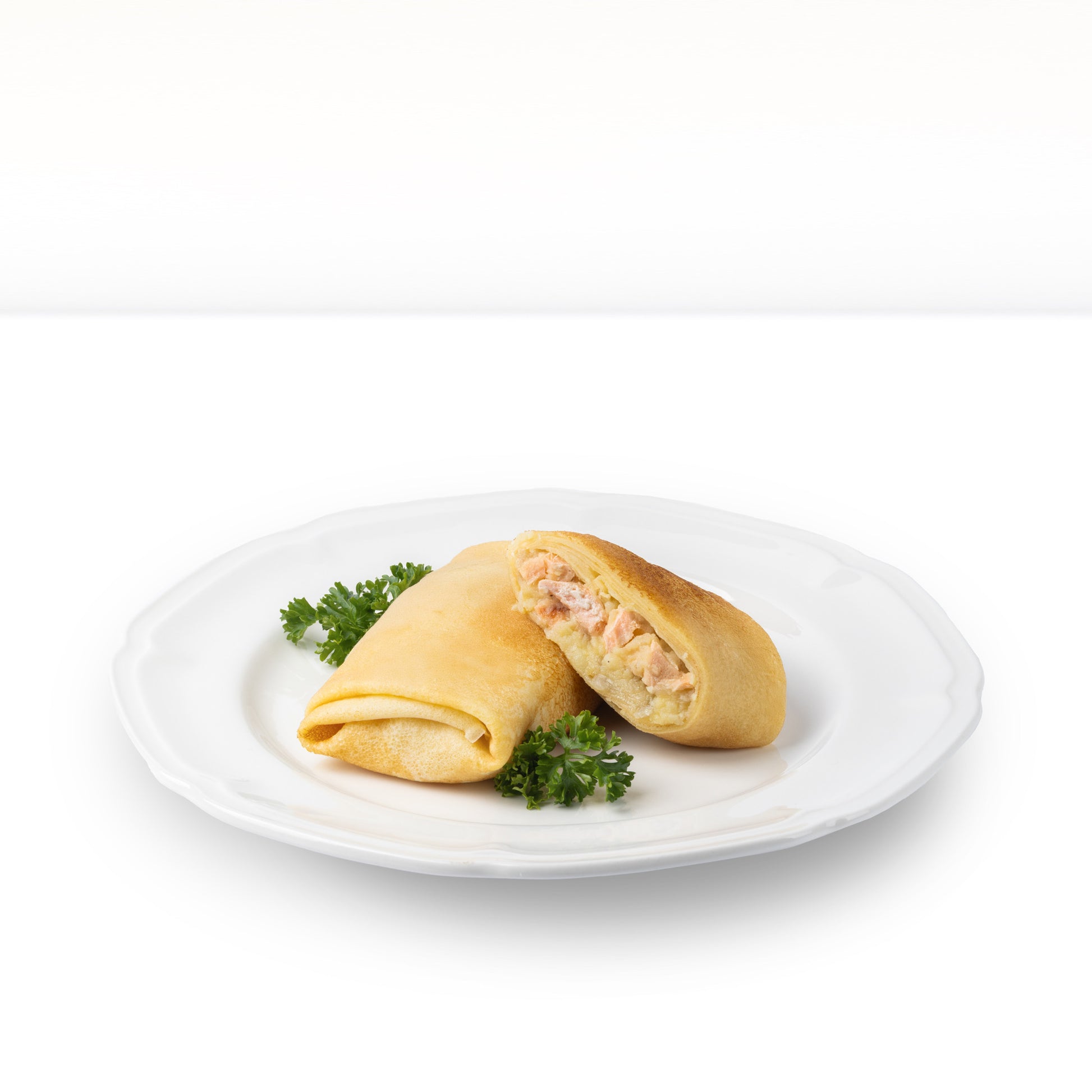 Zutaten: 50 % Füllung (Kartoffeln 60 %, Lachsfilet 30 %, Zwiebeln 10 %, Salz, Pfeffer), Gelbweizenmehl, Speiseöl, Milch, Eier, Zucker, Backpulver, Salz.